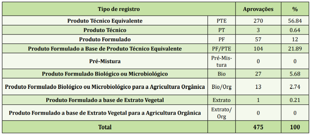 2019 foi o ano que marcou o recorde de aprovações de registro de produtos agroquímicos no Brasil. Foram 475 registros aprovados pelo Ministério da Agricultura. Dentre estes, 270 são registros de Produtos Técnicos Equivalentes, também conhecidos como produtos genéricos. A partir de 2019, o Ministério da Agricultura tem adotado novos procedimentos para aprovação dos registros de produtos técnicos equivalentes. Adicionalmente à documentação prevista em legislação, o MAPA tem requerido às empresas registrantes, documentação que comprove o registro no país de origem, juntamente com a licença de operação para fabricação do pesticida que se pleiteia o registro.