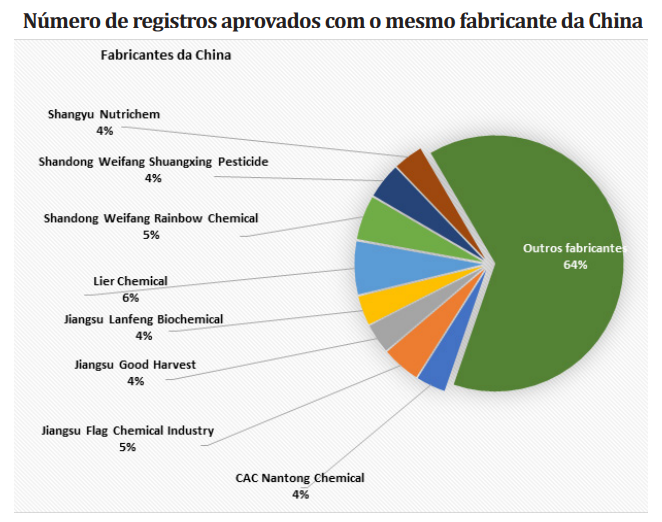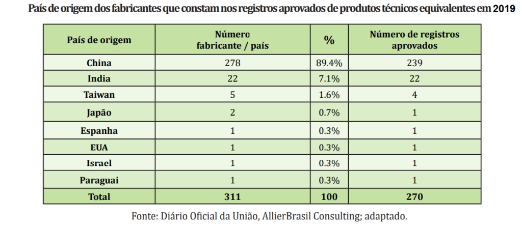 De acordo com levantamento realizado pela AllierBrasil Consulting, os fabricantes chineses representam 89,4% dos fabricantes que aparecem nos registros dos produtos técnicos equivalentes (278 vezes). A Índia, também tradicional fabricante de agroquímicos, vem em segundo lugar com 7,1% (22 vezes), seguida por Taiwan e Japão, com 1,6% (5 vezes) e 0,6% (2 vezes), respectivamente. Em 9 registros aprovados há fabricantes de dois países no mesmo registro. Em outro levantamento elaborado pela AllierBrasil Consulting (2019), mostra como a China tem conquistado reputação e por conseguinte a predominância no fornecimento de pesticidas genéricos em todos os continentes. Isto põem os fabricantes chineses em vantagens estratégicas com produção em escala e maior competitividade, à frente de outros países fabricantes.