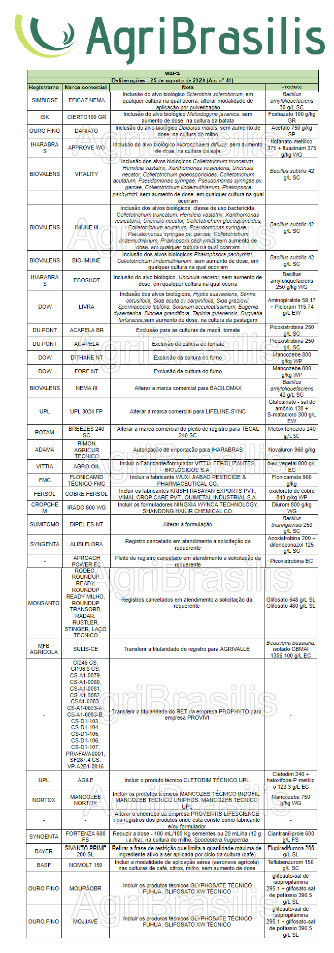 Deliberações do MAPA (25/08/2020) Registro de agrotóxicos Publicado em: 1 de setembro de 2020 Fonte: MAPA; adaptado por AgriBrasilis