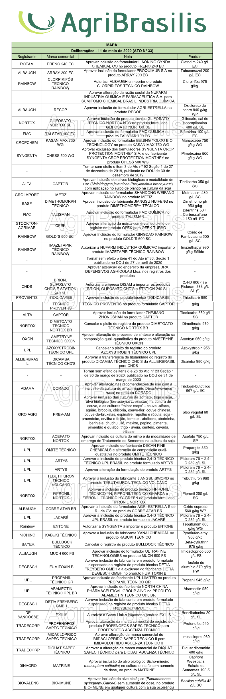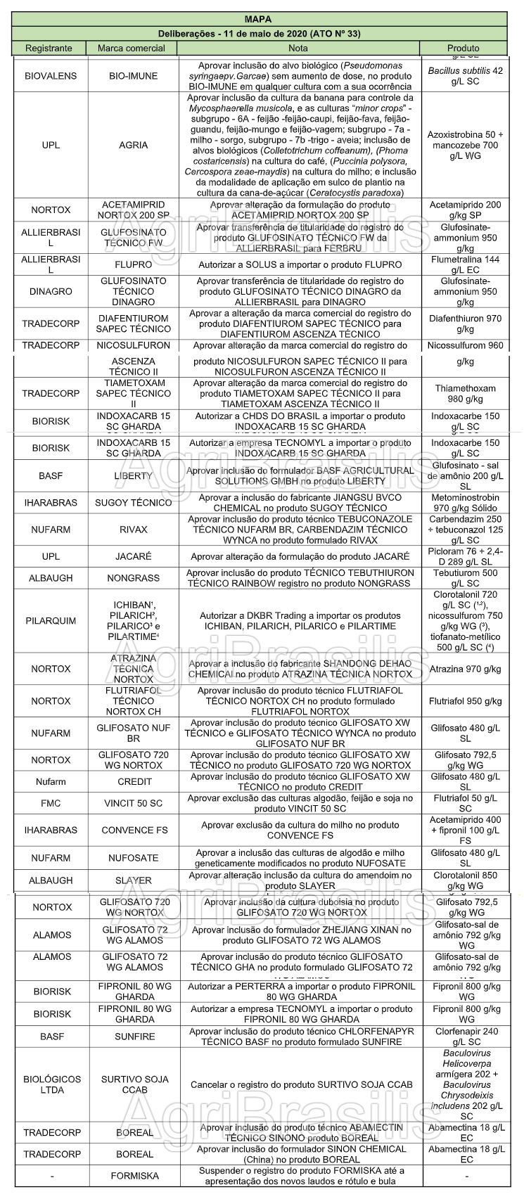 Deliberações do MAPA (11/05/2020) Registro de agrotóxicos Publicado em: 14 de setembro de 2020 Fonte: MAPA; Adaptado por AgriBrasilis