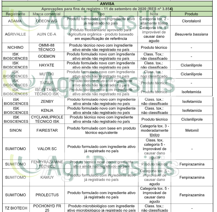 Aprovações para fins de registro – 11/09/2020 (Resolução nº 3854) Registro de agrotóxicos Publicado em: 20 de outubro de 2020