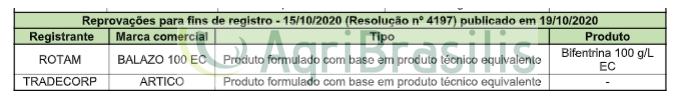Reprovações para fins de registro – 15/10/2020 (Resolução nº 4197) – Publicado em 19/10/2020 Registro de agrotóxicos Publicado em: 22 de outubro de 2020