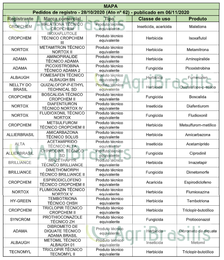 Pedidos de registro – 28/10/2020 (Ato nº 62) – publicado em 06/11/2020 Registro de agrotóxicos Publicado em: 9 de novembro de 2020