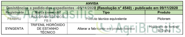 Desistências a pedido dos expedientes – 05/11/2020 (Resolução n° 4540) – publicado em 09/11/2020 Registro de agrotóxicos Publicado em: 11 de novembro de 2020