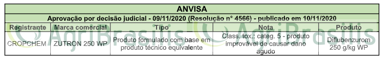 Aprovação por decisão judicial – 09/11/2020 (Resolução n° 4566) – publicado em 10/11/2020 Registro de agrotóxicos Publicado em: 17 de novembro de 2020
