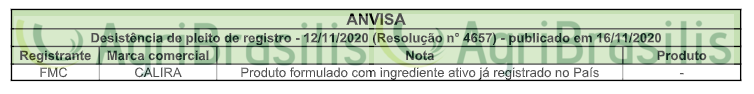 Desistência de pleito de registro – 12/11/2020 (Resolução n° 4657) – publicado em 16/11/2020 Registro de agrotóxicos Publicado em: 17 de novembro de 2020