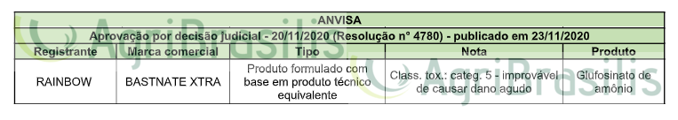 Aprovação por decisão judicial – 20/11/2020 (Resolução n° 4780) – publicado em 23/11/2020 Registro de agrotóxicos Publicado em: 23 de novembro de 2020
