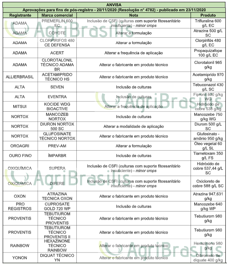 Aprovações para fins de pós-registro – 20/11/2020 (Resolução n° 4782) – publicado em 23/11/2020 Registro de agrotóxicos Publicado em: 23 de novembro de 2020