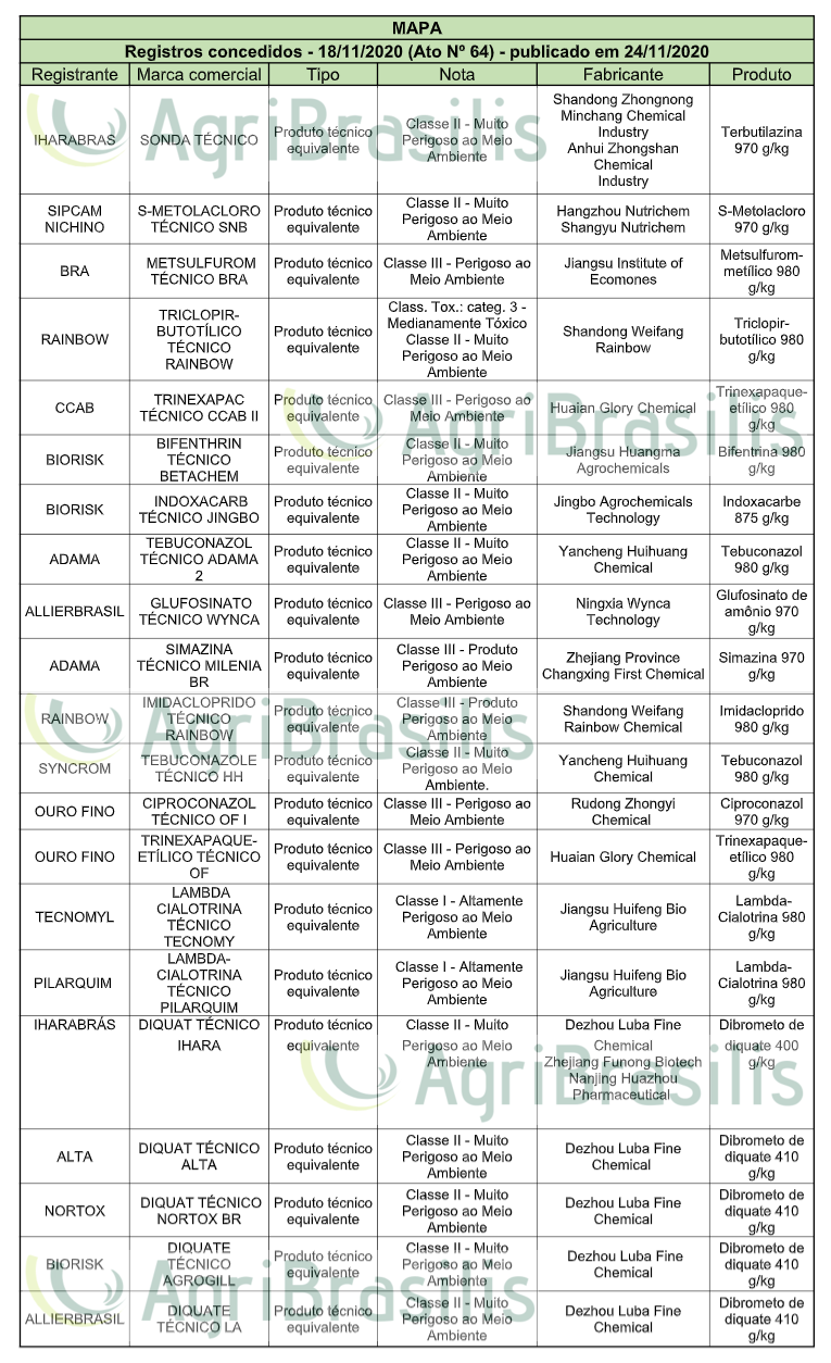 Registros concedidos – 18/11/2020 (Ato Nº 64) – publicado em 24/11/2020 Registro de agrotóxicos Publicado em: 27 de novembro de 2020