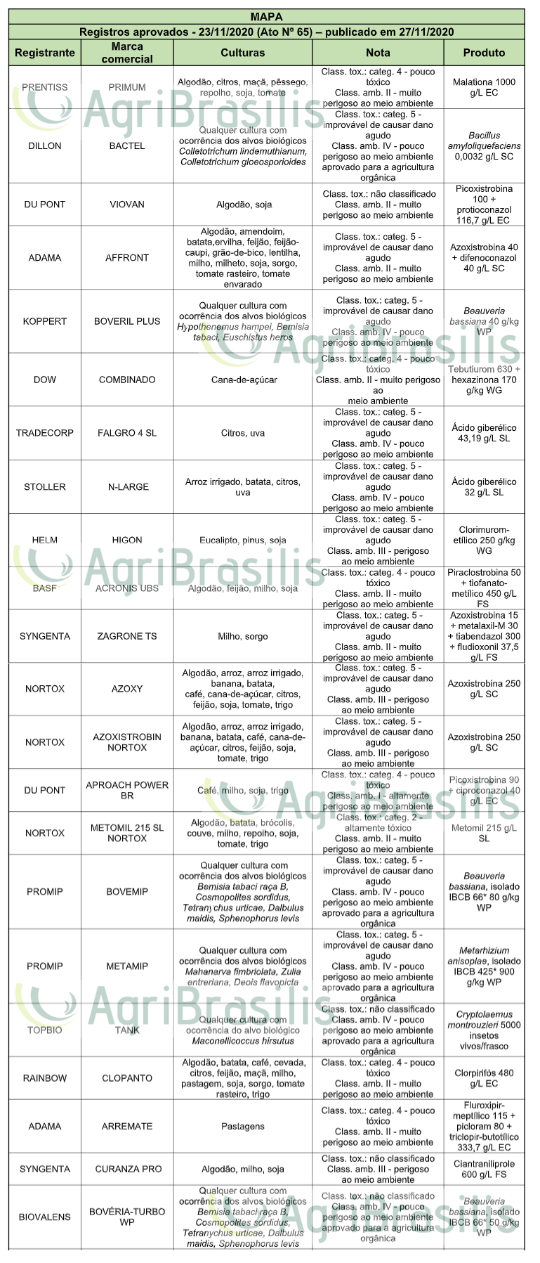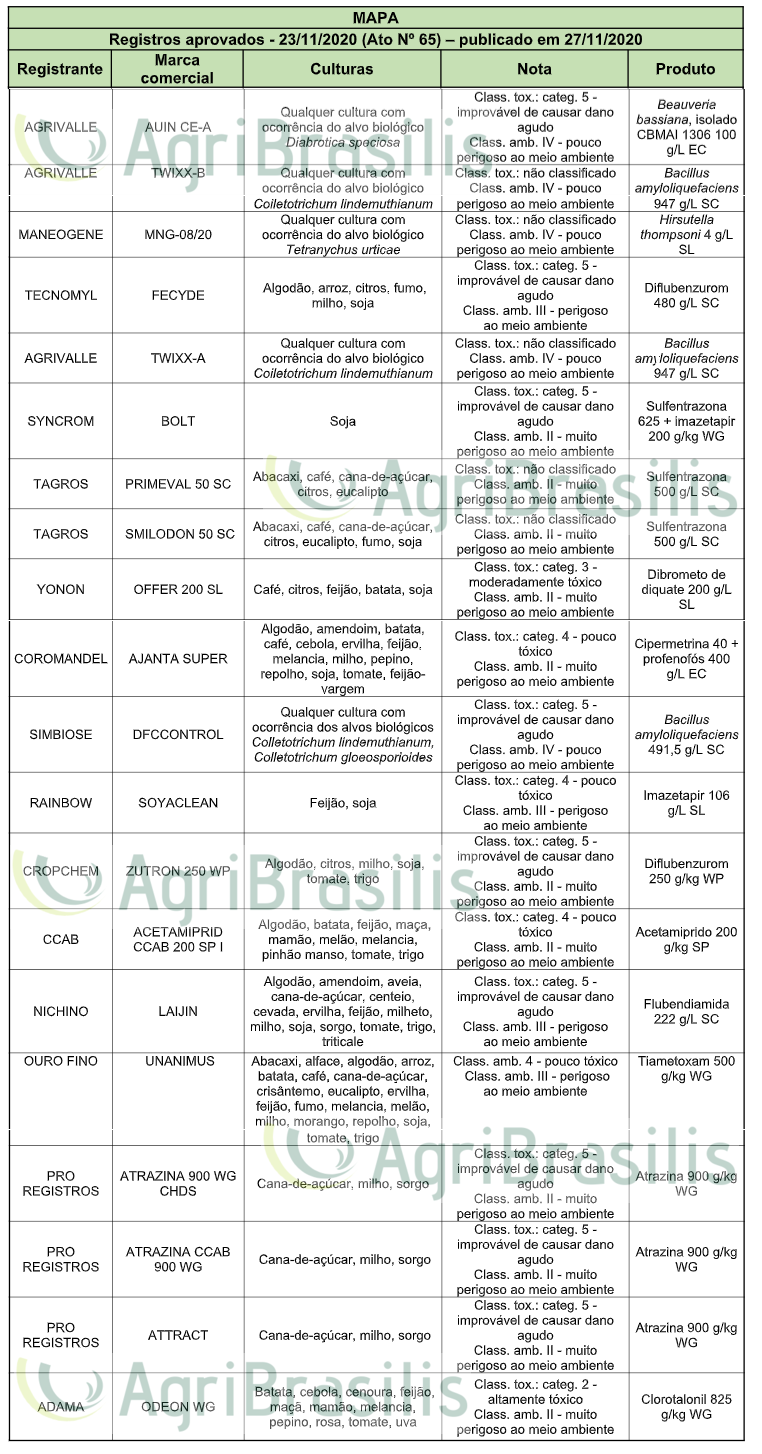 Registros aprovados – 23/11/2020 (Ato Nº 65) – publicado em 27/11/2020 Registro de agrotóxicos Publicado em: 8 de dezembro de 2020