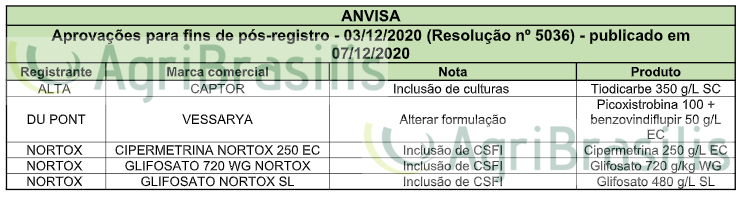 Aprovações para fins de pós-registro – 03/12/2020 (Resolução nº 5036) – publicado em 07/12/2020 Registro de agrotóxicos Publicado em: 9 de dezembro de 2020