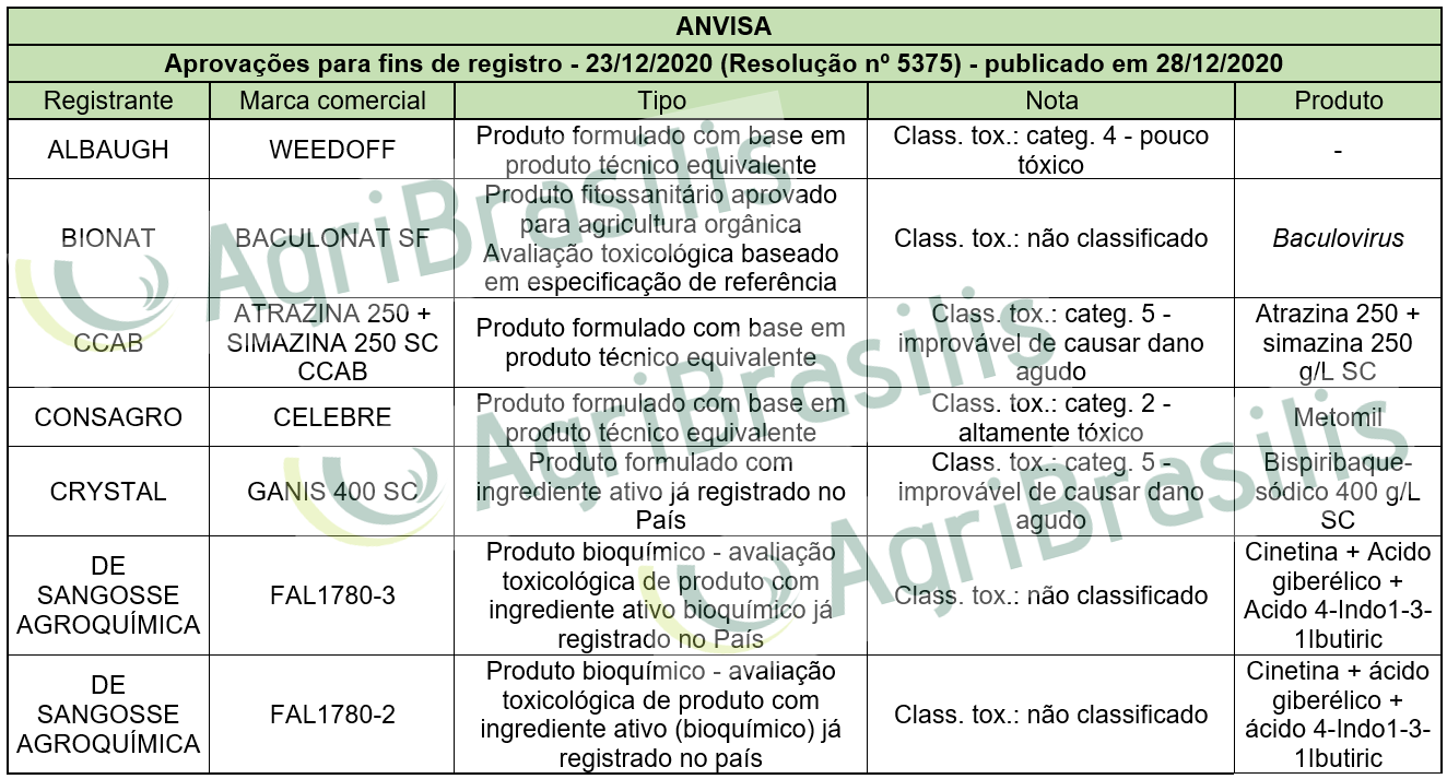 Aprovações para fins de registro – 23/12/2020 (Resolução nº 5375) – publicado em 28/12/2020 Registro de agrotóxicos Publicado em: 5 de janeiro de 2021