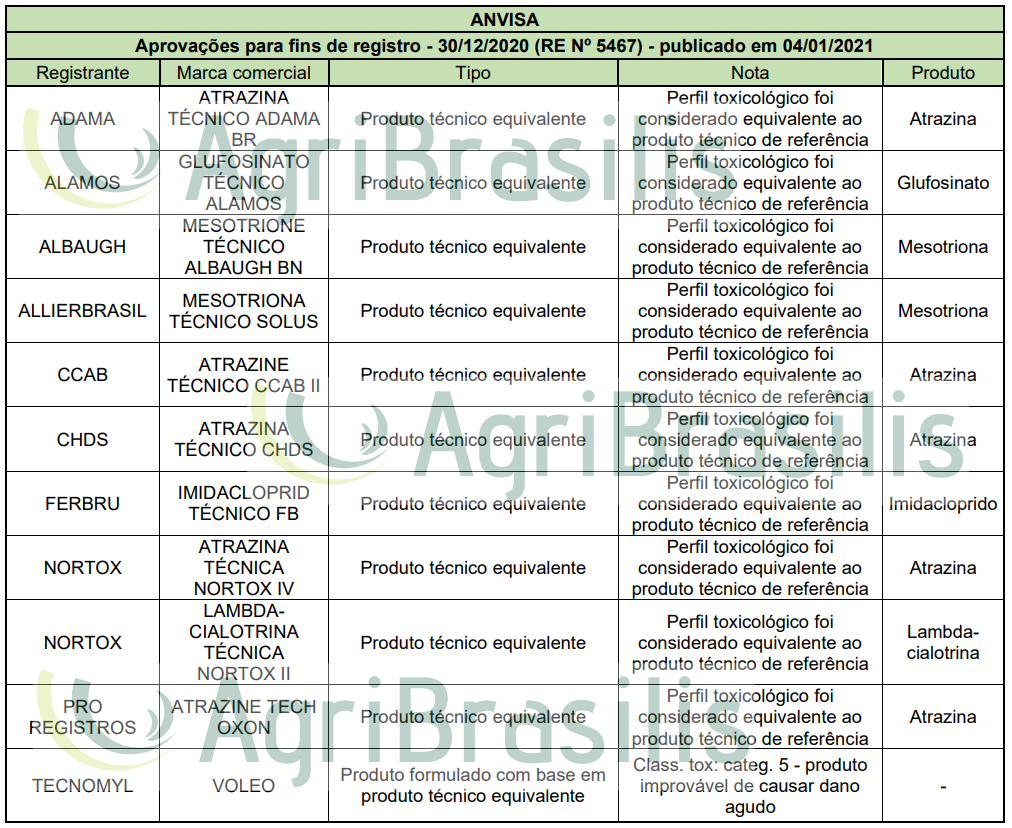 Aprovações para fins de registro – 30/12/2020 (RE Nº 5467) – publicado em 04/01/2021 Registro de agrotóxicos Publicado em: 8 de janeiro de 2021