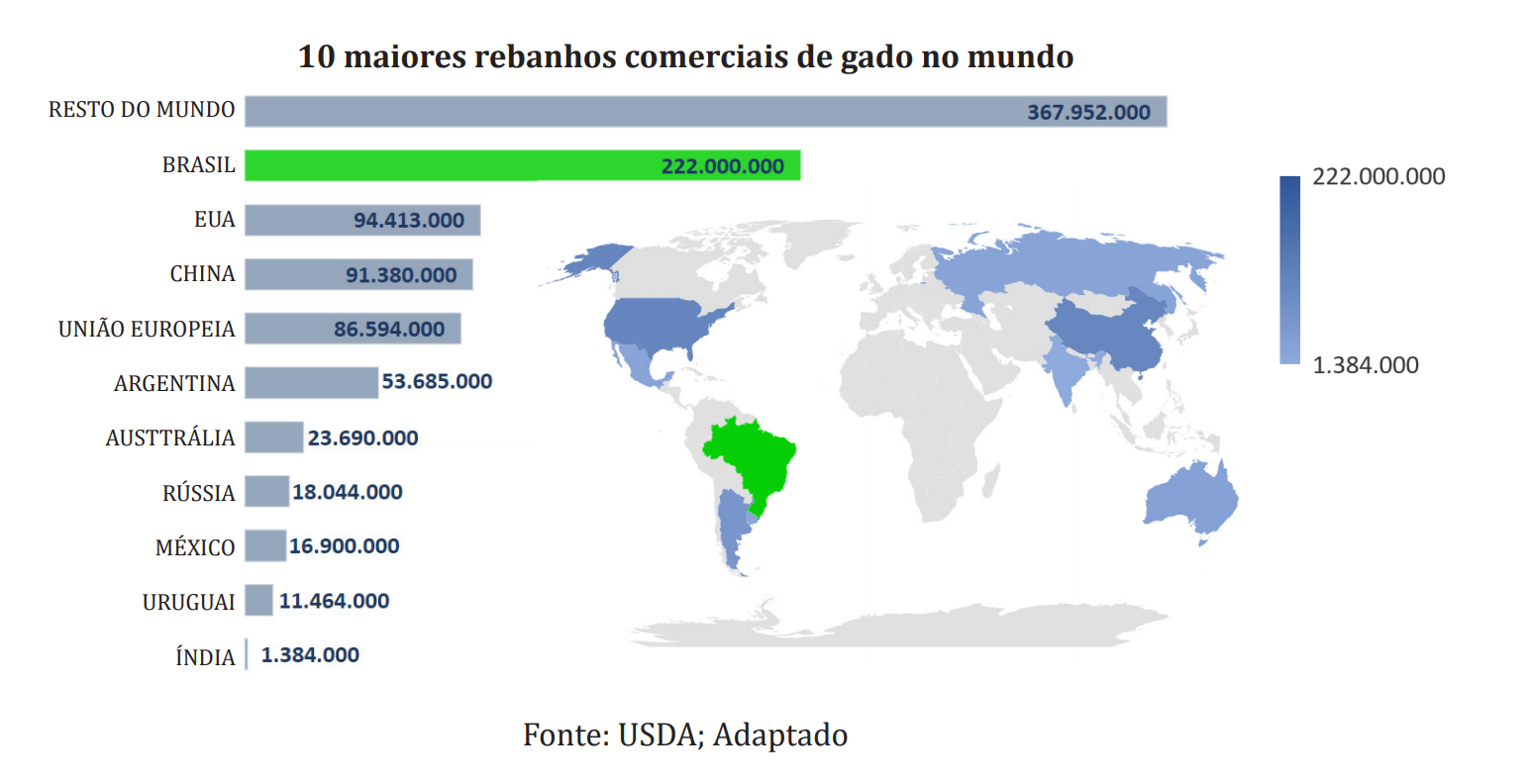 Com 162,3 milhões de hectares destinados apenas à pecuária, que somam 19,06% da área total do País, desde o ano de 2018, o Brasil sustenta o título de maior rebanho comercial do mundo¹, com aproximadamente 222 milhões de cabeças, como pode ser conferido no seguinte gráfico ²: