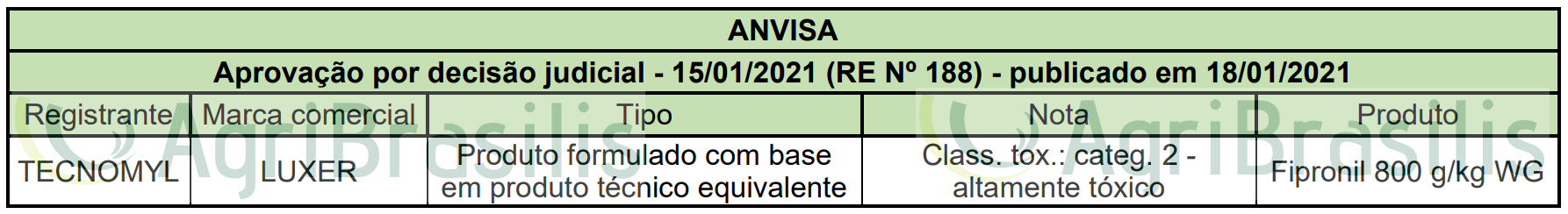 Aprovação por decisão judicial – 15/01/2021 (RE Nº 188) – publicado em 18/01/2021 Registro de agrotóxicos Publicado em: 21 de janeiro de 2021