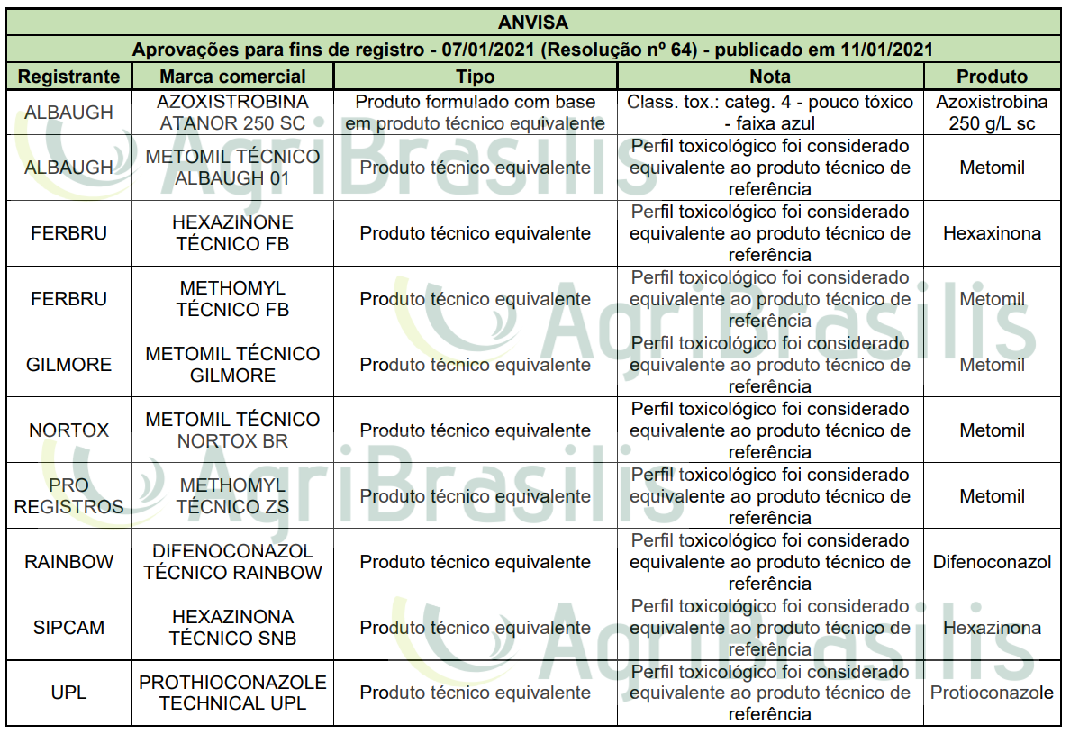 Aprovações para fins de registro – 07/01/2021 (Resolução nº 64) – publicado em 11/01/2021 Registro de agrotóxicos Publicado em: 5 de fevereiro de 2021