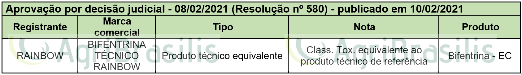 Aprovação por decisão judicial – 08/02/2021 (Resolução nº 580) – publicado em 10/02/2021 Registro de agrotóxicos Publicado em: 11 de fevereiro de 2021