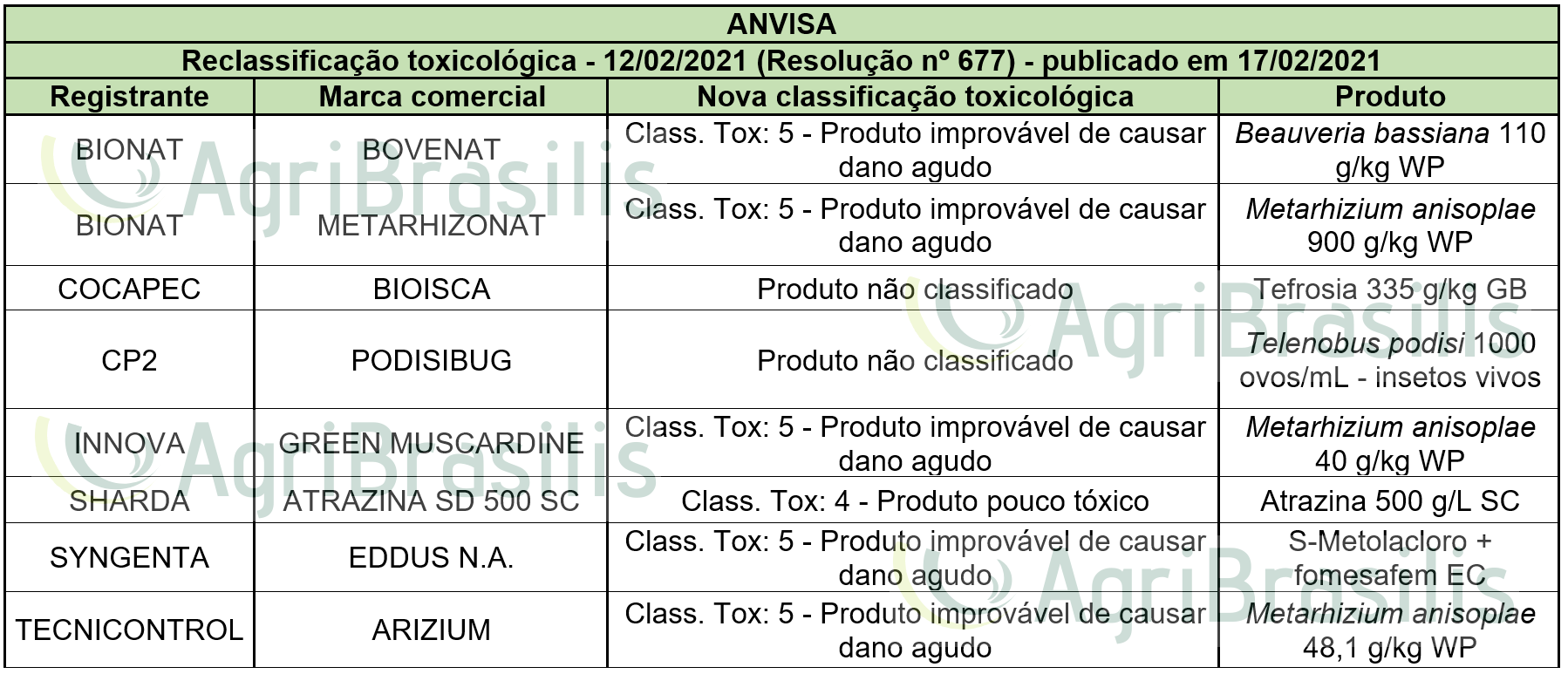 Reclassificação toxicológica – 12/02/2021 (Resolução nº 677) – publicado em 17/02/2021 Registro de agrotóxicos Publicado em: 17 de fevereiro de 2021