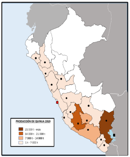 | A produção de quinoa no Peru recai principalmente sobre pequenos produtores (individuais e associados) que cultivam em condições secas (com água da chuva). Em 2012, de acordo com o Censo Agropecuário, dos 69 mil produtores de quinoa, 94% praticavam o cultivo de sequeiro. Na estrutura agrária, 58% dos produtores dirigem unidades menores que 3 ha, 14% entre 3 a 5 ha, 14% de 5 a 10 ha e 14% mais que 10 ha, sendo sua produção na agricultura de subsistência e familiar , e infere-se que os 42% restantes correspondem à agricultura comercial (IICA, 2015). O principal departamento de produção é Puno, que em 2012 concentrava 82% dos produtores e produzia 68% do total nacional, onde a produção atende pequenos produtores quíchuas e aimarás acima de 3.600 metros acima do nível do mar, nos arredores do lago Titicaca (Mapa), onde se destina a si -consumo em alta proporção, entre 16% a 42%. |