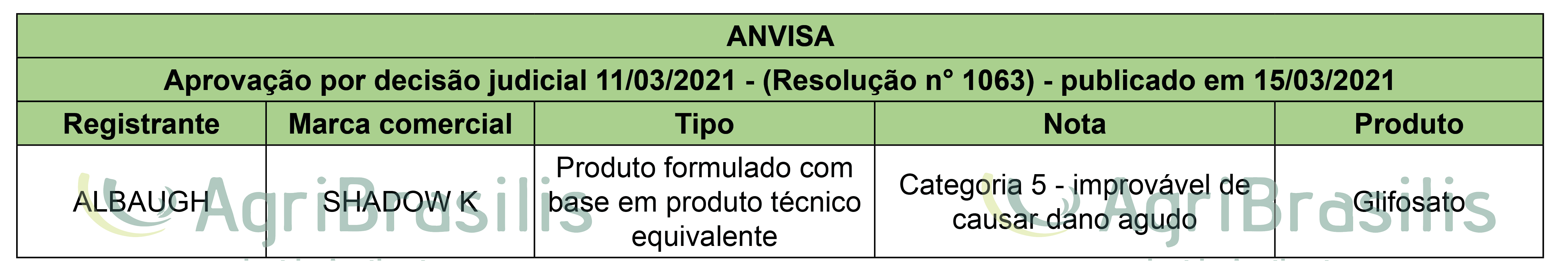 Aprovação por decisão judicial 11/03/2021 – (Resolução n° 1063) – publicado em 15/03/2021 Registro de agrotóxicos Publicado em: 15 de março de 2021