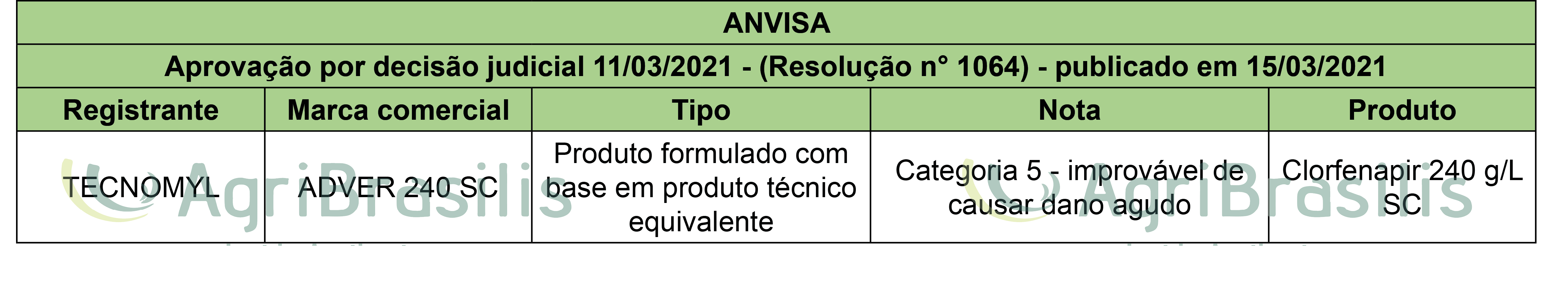 Aprovação por decisão judicial 11/03/2021 – (Resolução n° 1064) – publicado em 15/03/2021 Registro de agrotóxicos Publicado em: 15 de março de 2021