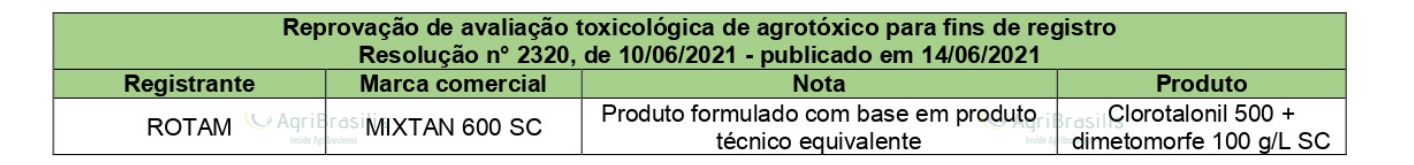 Reprovação de avaliação toxicológica de agrotóxico para fins de registro Resolução n° 2320, de 10/06/2021 – publicado em 14/06/2021 Registro de agrotóxicos Publicado em: 17 de junho de 2021