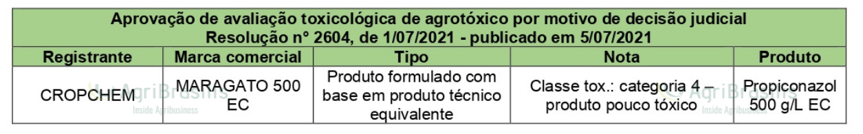Aprovação de avaliação toxicológica de agrotóxico por motivo de decisão judicial Resolução n° 2604, de 1/07/2021 – publicado em 5/07/2021 Registro de agrotóxicos Publicado em: 6 de julho de 2021