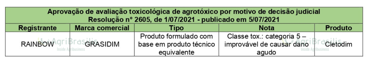 Aprovação de avaliação toxicológica de agrotóxico por motivo de decisão judicial Resolução n° 2605, de 1/07/2021 – publicado em 5/07/2021 Registro de agrotóxicos Publicado em: 6 de julho de 2021