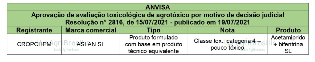 Aprovação de avaliação toxicológica de agrotóxico por motivo de decisão judicial Resolução n° 2816, de 15/07/2021 – publicado em 19/07/2021 Registro de agrotóxicos Publicado em: 20 de julho de 2021