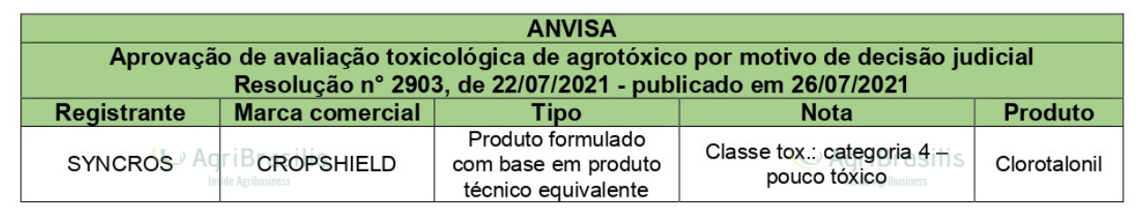 Aprovação de avaliação toxicológica de agrotóxico por motivo de decisão judicial Resolução n° 2903, de 22/07/2021 – publicado em 26/07/2021 Registro de agrotóxicos Publicado em: 27 de julho de 2021