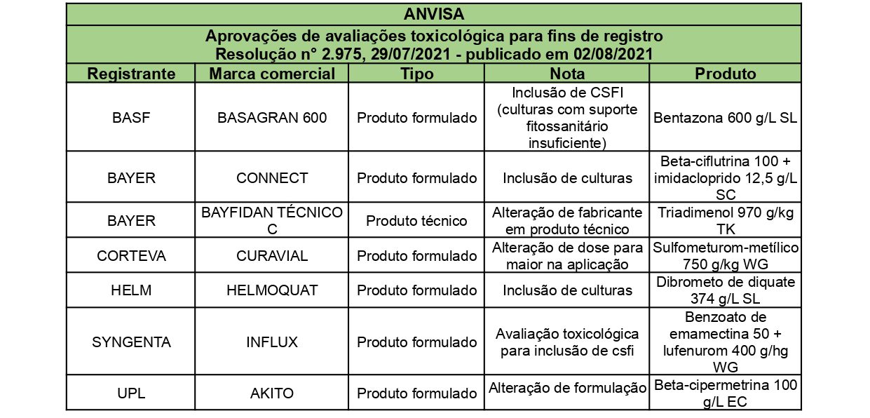 Aprovações de avaliações toxicológica para fins de registro Resolução n° 2.975, 29/07/2021 – publicado em 02/08/2021 Registro de agrotóxicos Publicado em: 17 de agosto de 2021