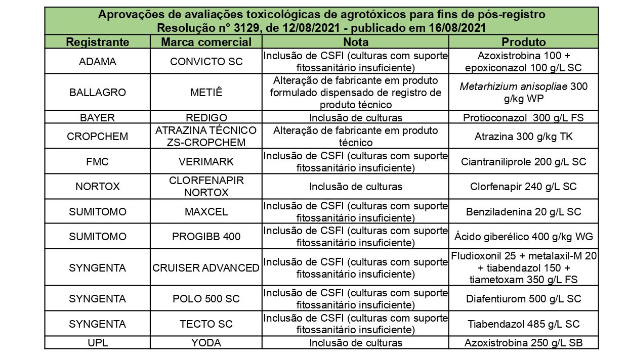 Aprovações de avaliações toxicológicas de agrotóxicos para fins de pós-registro Resolução n° 3129, de 12/08/2021 – publicado em 16/08/2021 Registro de agrotóxicos Publicado em: 18 de agosto de 2021