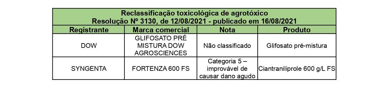 Reclassificação toxicológica de agrotóxico – Resolução Nº 3130, de 12/08/2021 – publicado em 16/08/2021 Registro de agrotóxicos Publicado em: 18 de agosto de 2021
