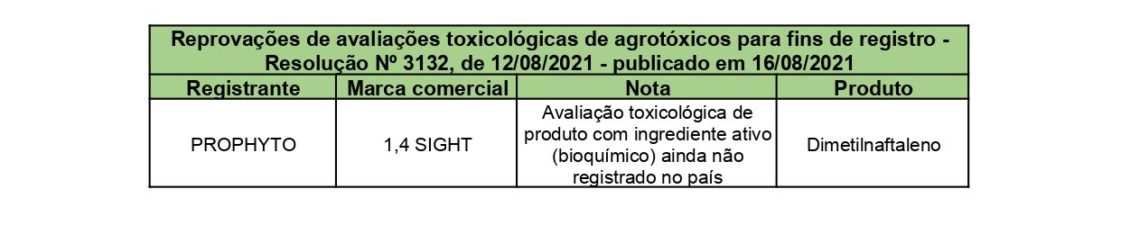 Reprovações de avaliações toxicológicas de agrotóxicos para fins de registro – Resolução Nº 3132, de 12/08/2021 – publicado em 16/08/2021 Sem categoria Publicado em: 18 de agosto de 2021