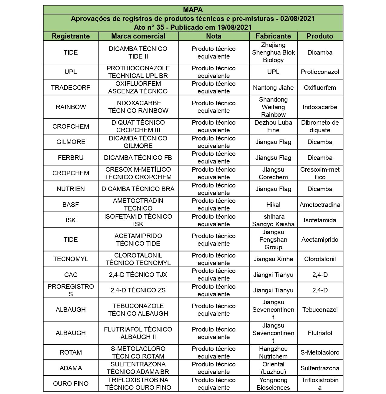 Aprovações de registros de produtos técnicos e pré-misturas – 02/08/2021 Ato n° 35 – Publicado em 19/08/2021 Sem categoria Publicado em: 27 de agosto de 2021