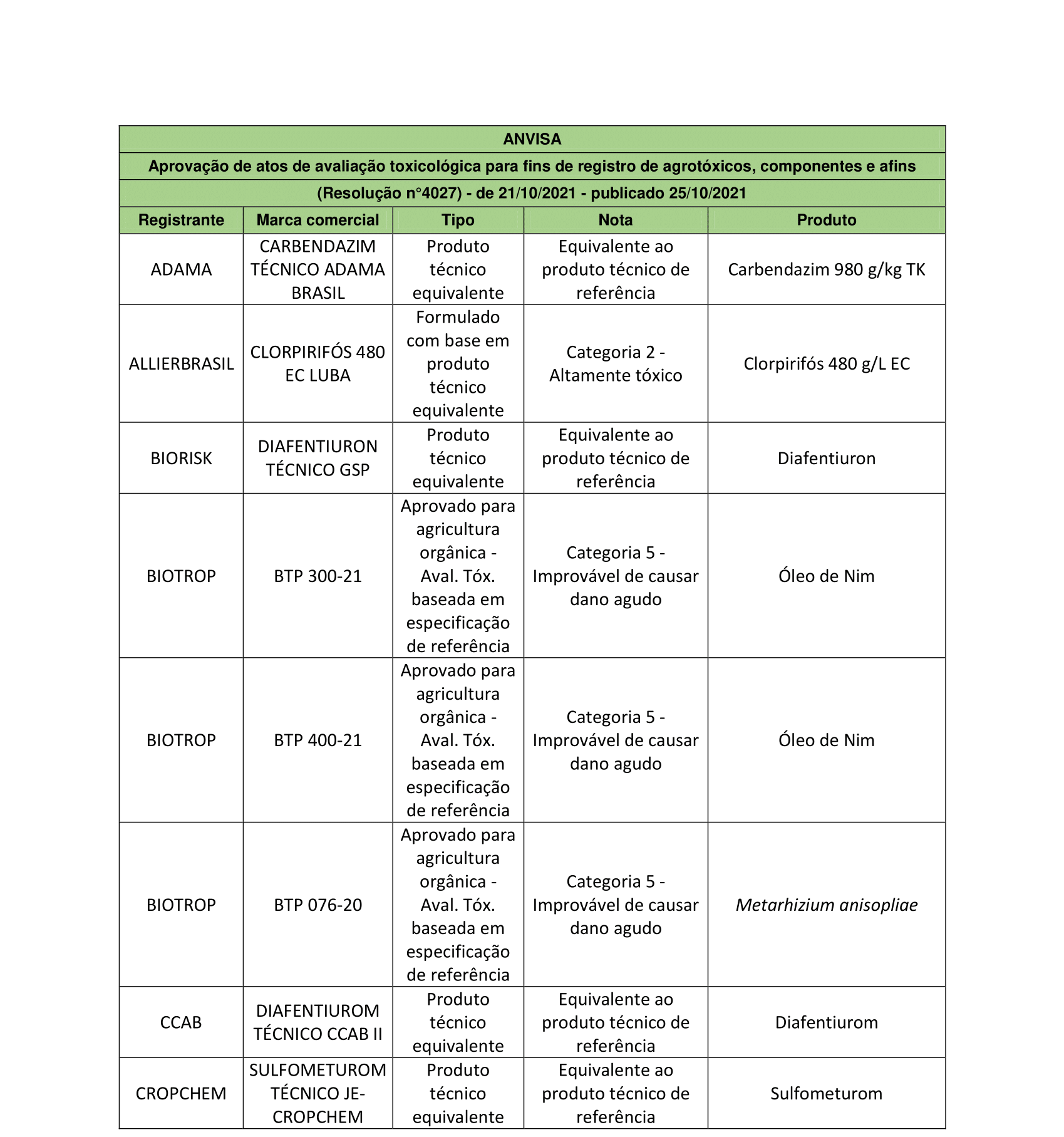 Aprovação de atos de avaliação toxicológica para fins de registro de agrotóxicos, componentes e afins (Resolução n°4027) – de 21/10/2021 – publicado 25/10/2021 Agricultura, Registro de agrotóxicos Publicado em: 26 de outubro de 2021