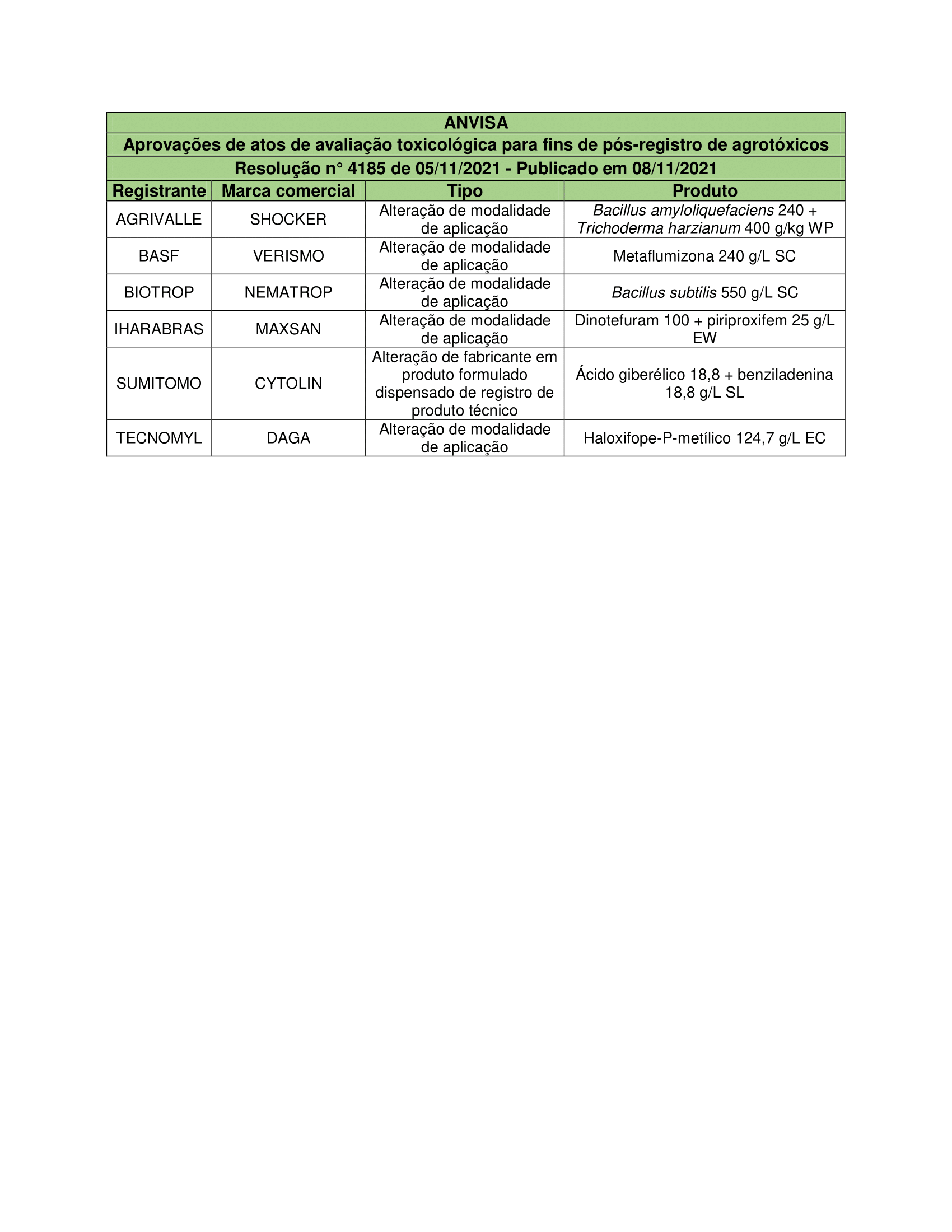Aprovações de atos de avaliação toxicológica para fins de pós-registro de agrotóxicos – Resolução n° 4185 de 05/11/2021 – Publicado em 08/11/2021 Agrotóxicos, Defensivos agrícolas, Registro de agrotóxicos Publicado em: 16 de novembro de 2021