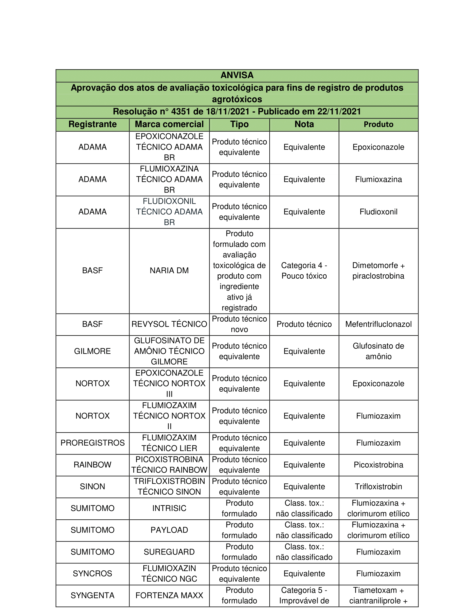 Aprovação dos atos de avaliação toxicológica para fins de registro de produtos agrotóxicos – Resolução n° 4351 de 18/11/2021 – Publicado em 22/11/2021 Agrotóxicos, Defensivos agrícolas Publicado em: 24 de novembro de 2021