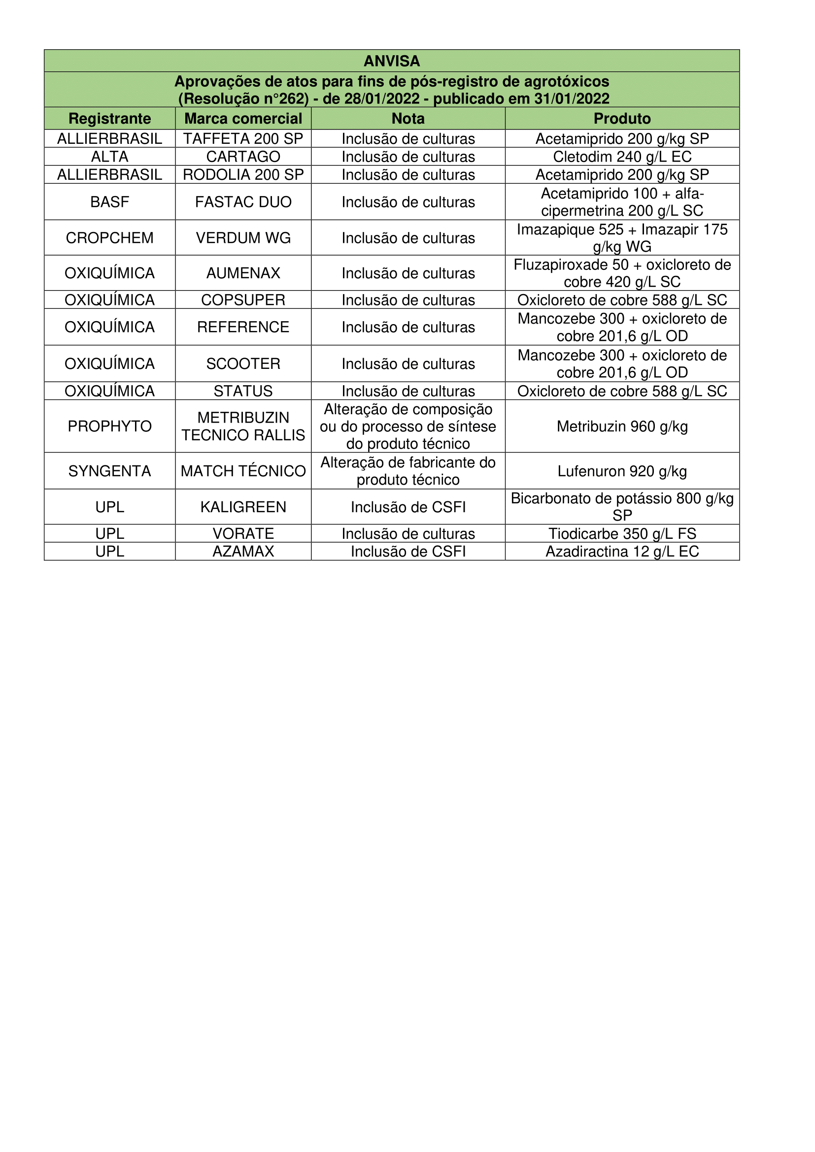 Aprovações de atos para fins de pós-registro de agrotóxicos (Resolução n°262) – de 28/01/2022 – publicado em 31/01/2022 Agrotóxicos Publicado em: 4 de fevereiro de 2022