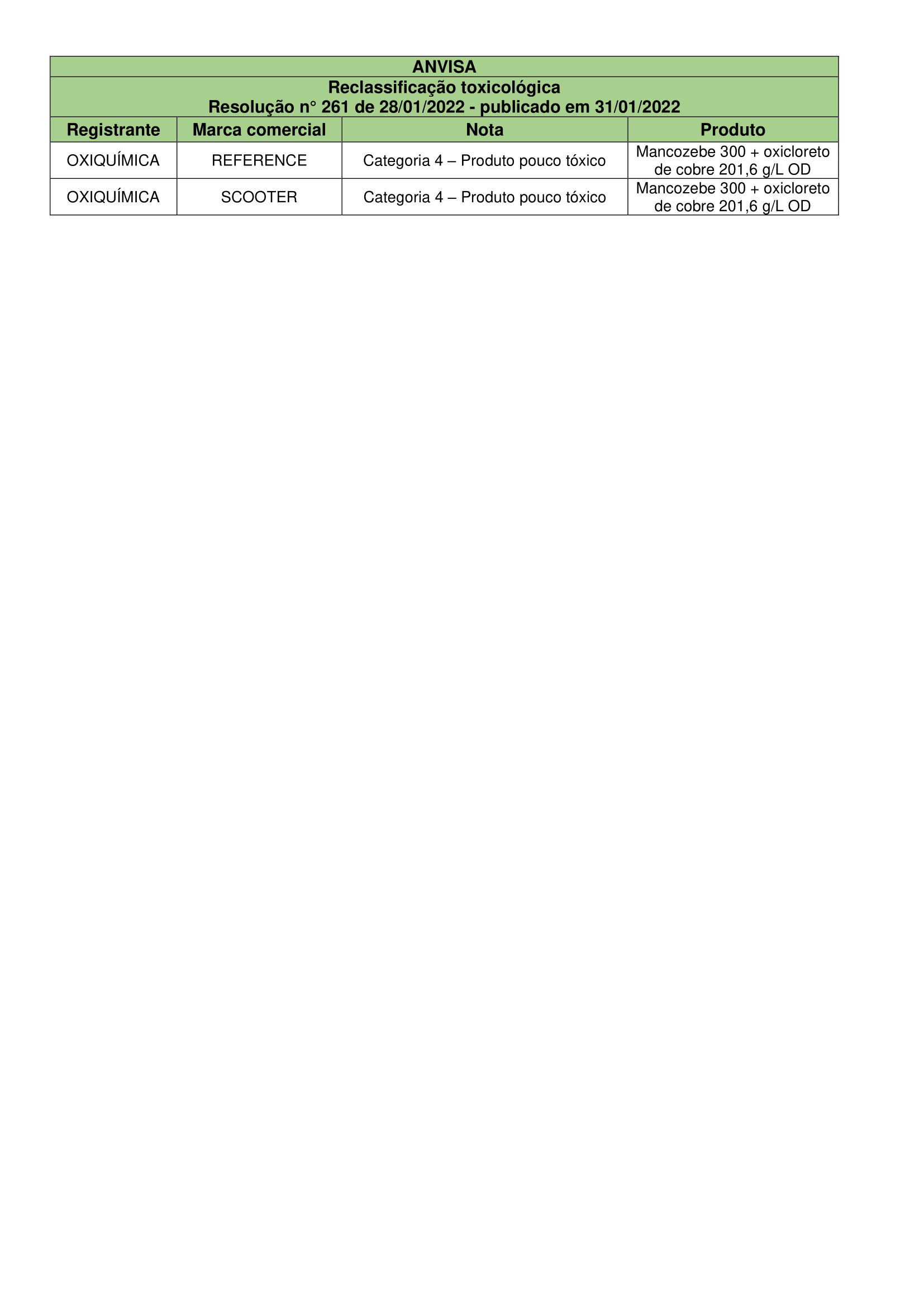 Reclassificação toxicológica Resolução n° 261 de 28/01/2022 – Publicado em 31/01/2022 Agrotóxicos, Defensivos agrícolas, Registro de agrotóxicos Publicado em: 7 de fevereiro de 2022