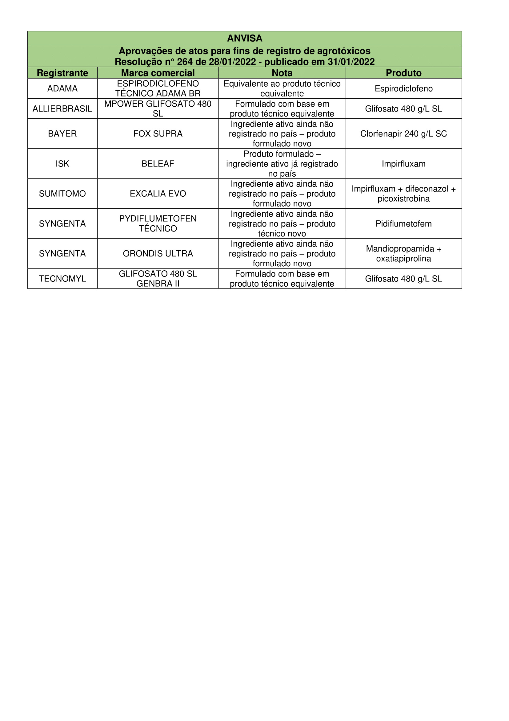 Aprovações de atos para fins de registro de agrotóxicos Resolução n° 264 de 28/01/2022 – Publicado em 31/01/2022 Sem categoria Publicado em: 8 de fevereiro de 2022