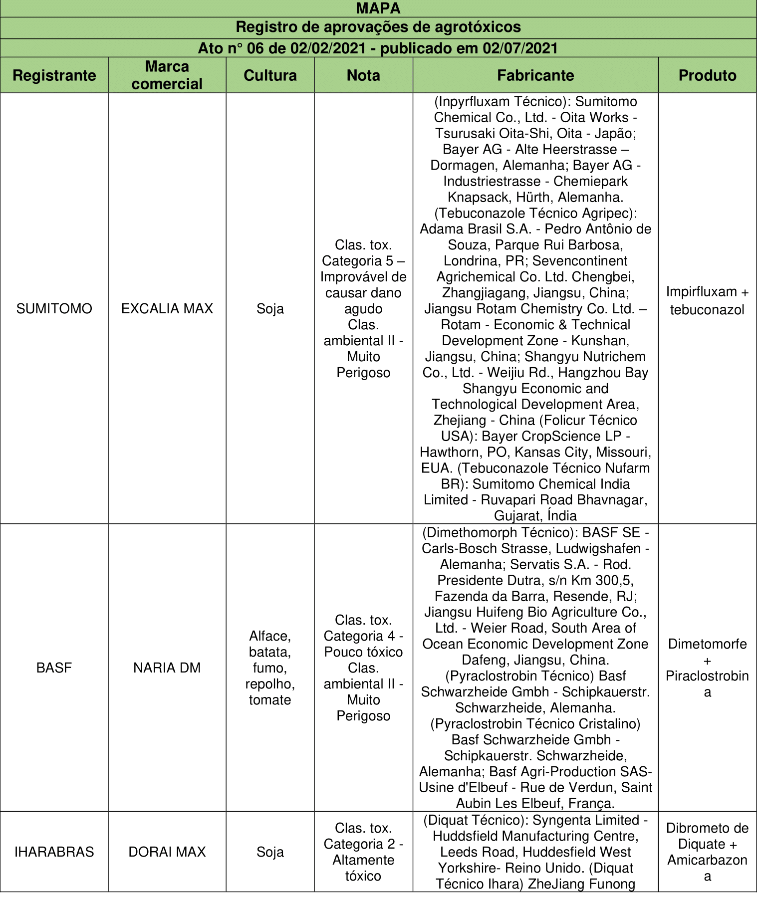 Aprovações de registros de agrotóxicos – Ato nº 06 de 02/02/2022 – publicado em 07/02/2022 Sem categoria Publicado em: 10 de fevereiro de 2022