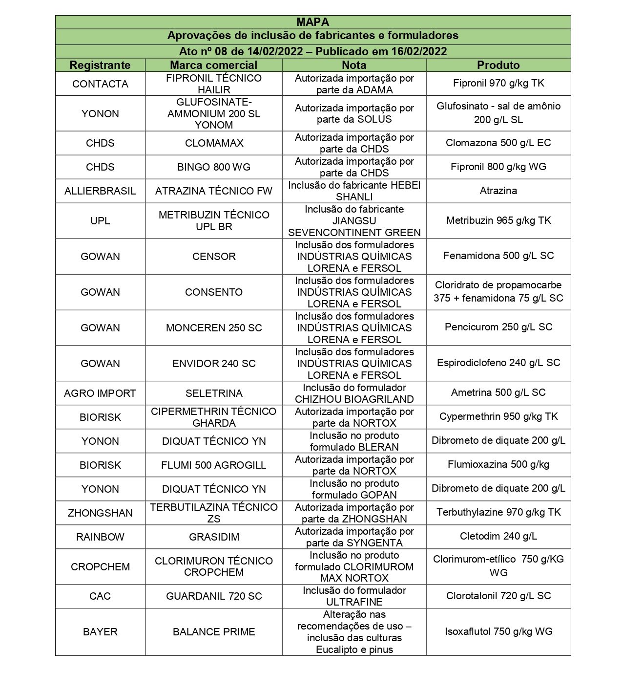 Aprovações de inclusão de fabricantes e formuladores – Ato N° 08 de 14/02/2022 publicado em 16/02/2022 Sem categoria Publicado em: 23 de fevereiro de 2022
