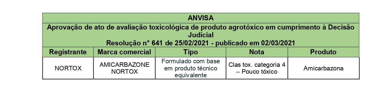 Aprovação de ato de avaliação toxicológica de produto agrotóxico em cumprimento à Decisão Judicial – Resolução n° 641 de 25/02/2021 publicado em 02/03/2021 Agrotóxicos, Defensivos agrícolas, Registro de agrotóxicos Publicado em: 4 de março de 2022