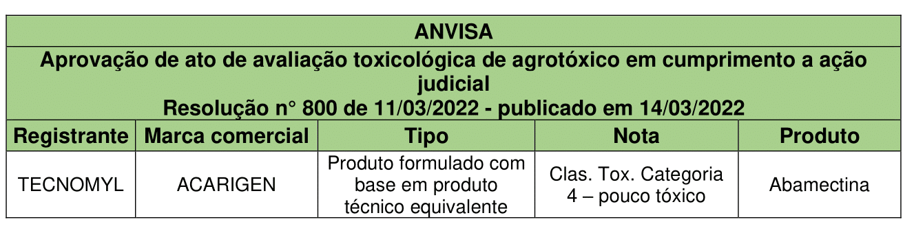 Aprovação de ato de avaliação toxicológica de agrotóxico em cumprimento a ação judicial Resolução n° 800 de 11/03/2022 – Publicado em 14/03/2022 Sem categoria Publicado em: 14 de março de 2022