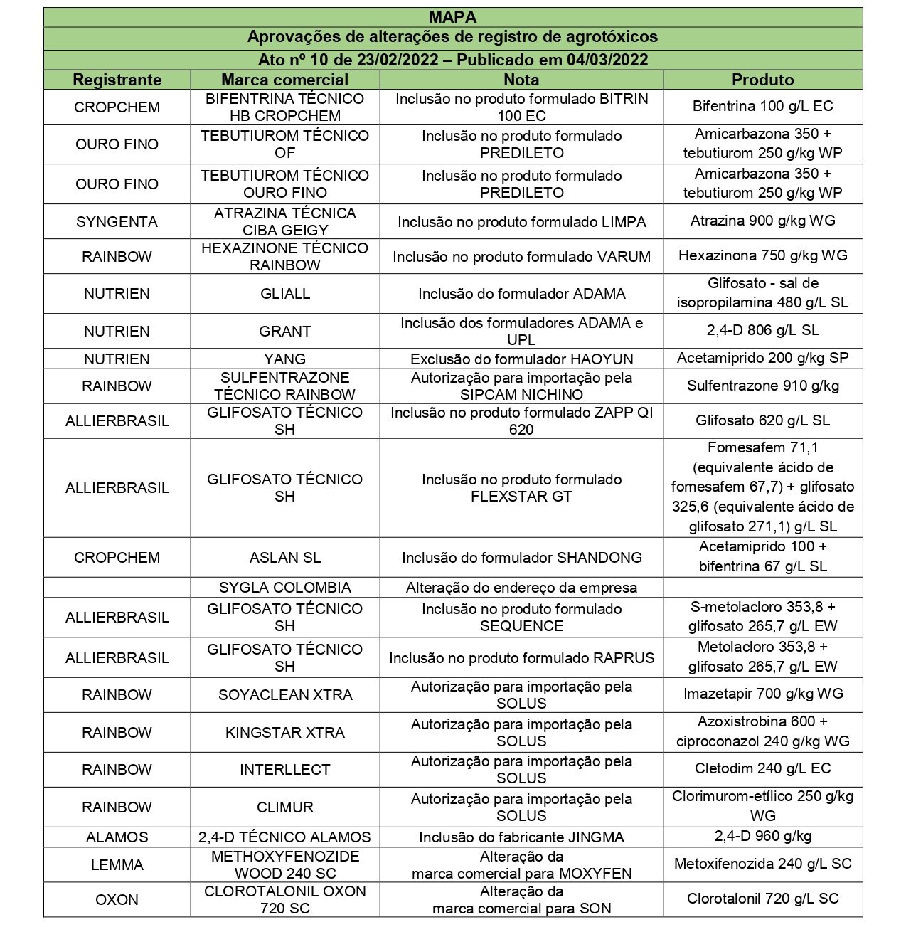 Aprovações de alterações de registro de agrotóxicos – Ato nº 10 de 23/02/2022 – Publicado em 04/03/2022 AgriBrasilis, Agricultura, Registro de agrotóxicos Publicado em: 24 de março de 2022