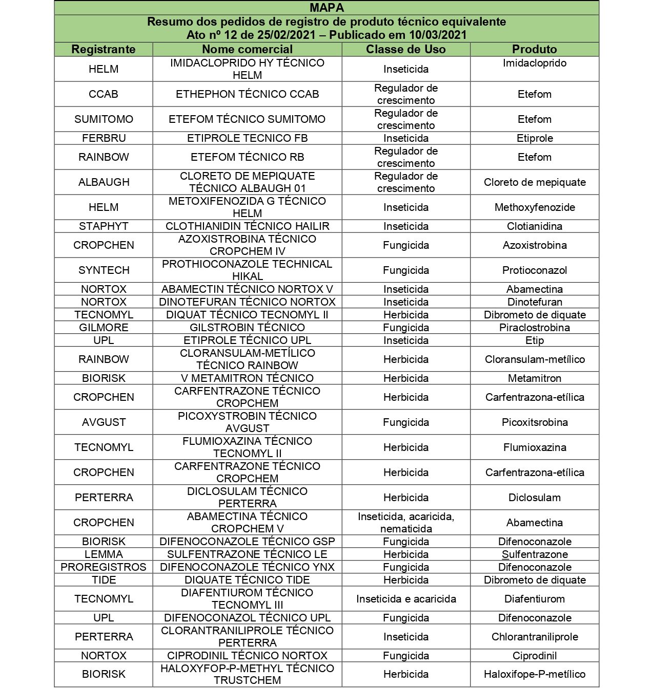 Resumo dos pedidos de registro de produto técnico equivalente Ato nº 12 de 25/02/2021 – Publicado em 10/03/2021 AgriBrasilis, Agricultura, Defensivos agrícolas, Registro de agrotóxicos Publicado em: 24 de março de 2022