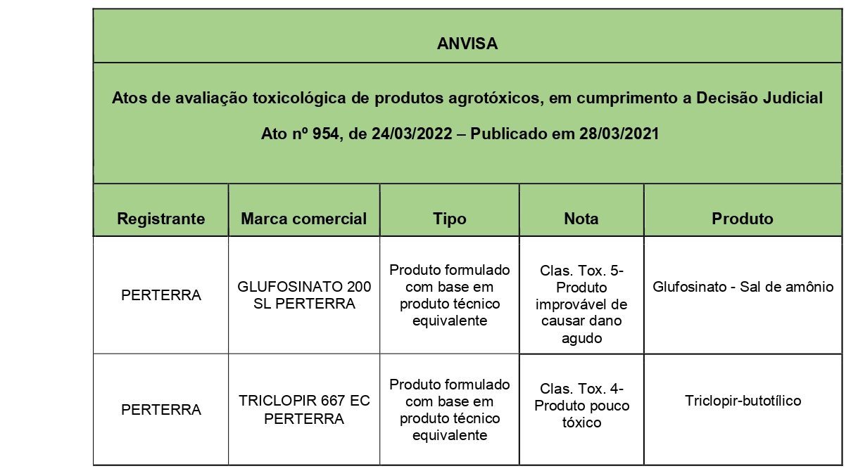 Atos de avaliação toxicológica de produtos agrotóxicos, em cumprimento a Decisão Judicial -Ato nº 954, de 24/03/2022 – Publicado em 28/03/2021