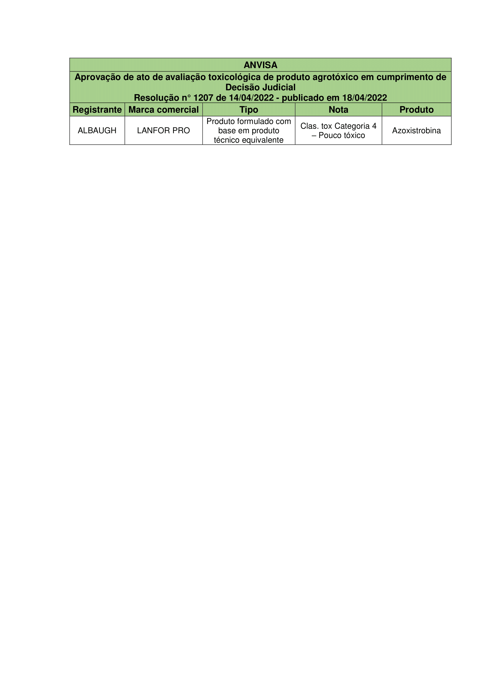 Aprovação de ato de avaliação toxicológica de produto agrotóxico em cumprimento de Decisão Judicial – Resolução No. 1207 de 14/04/2022 – publicado em 18/04/2022 Registro de agrotóxicos Publicado em: 19 de abril de 2022