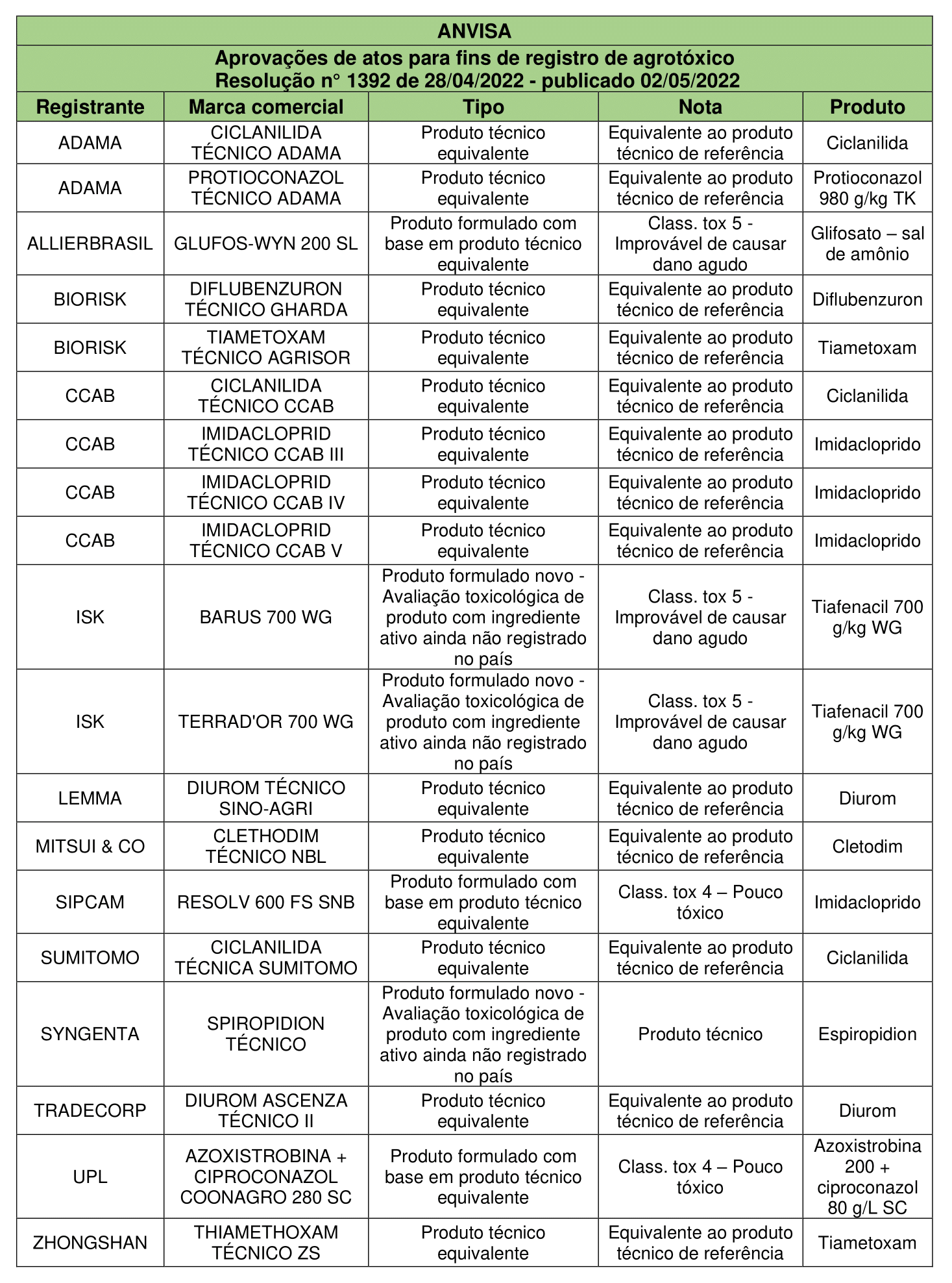 Aprovações de atos para fins de registro de agrotóxico – Resolução n° 1392 de 28/04/2022 – publicado 02/05/2022 Agrotóxicos, Defensivos agrícolas Publicado em: 3 de maio de 2022